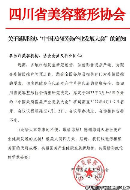 因為疫情的影響,為了配合疫情防控和管理工作,原定于3月5日-6日召開的中國天府醫(yī)美產(chǎn)業(yè)發(fā)展大會,延期至4月1日-2日召開,屆時將邀請行業(yè)行業(yè)學(xué)術(shù)醫(yī)師、機構(gòu)嘉賓代表、平臺嘉賓代表以及業(yè)內(nèi)人士,一同共話醫(yī)美產(chǎn)業(yè)健康發(fā)展新趨勢,期待這一次精彩絕倫的學(xué)術(shù)盛宴!