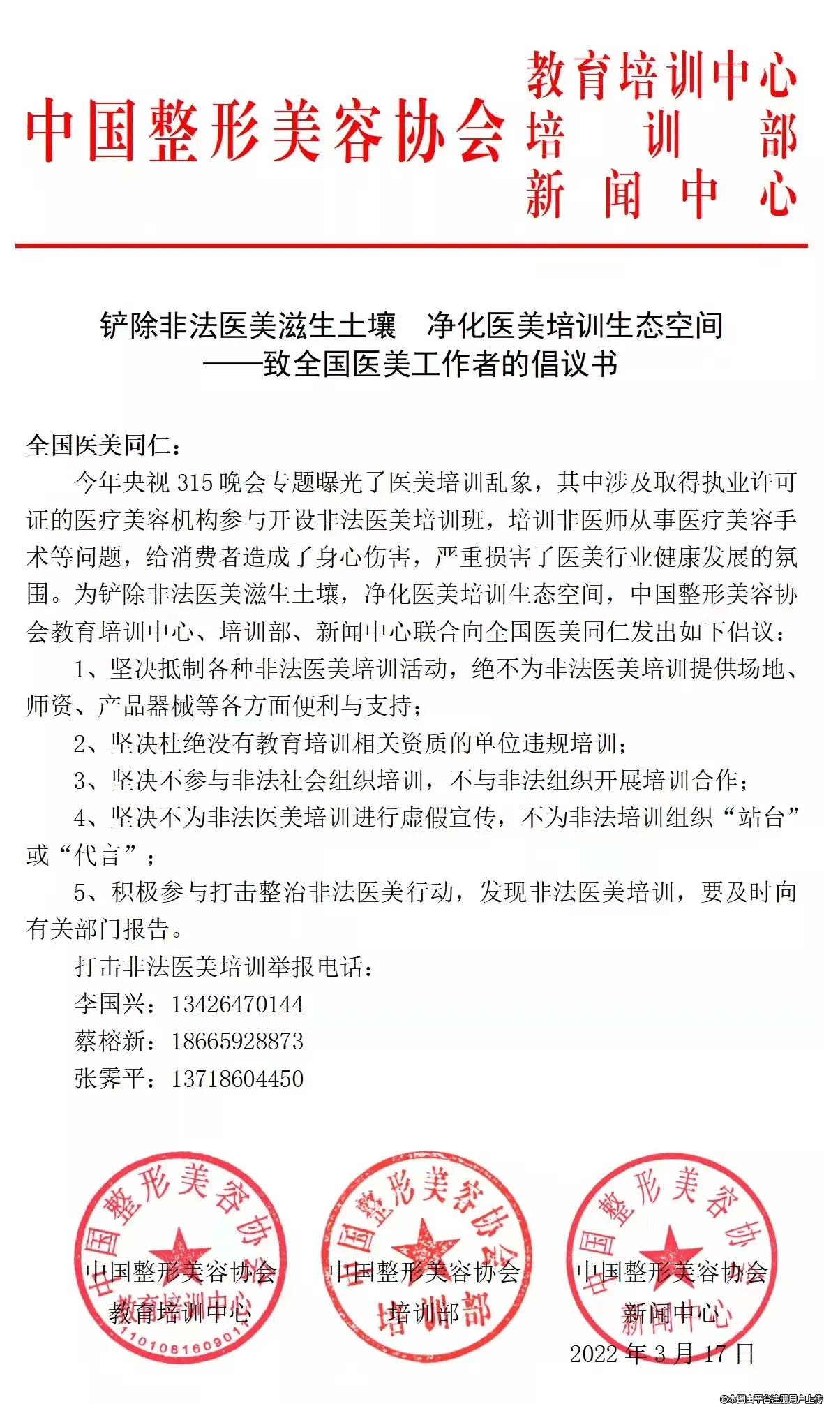 今年央視315晚會(huì)專題曝光了醫(yī)美培訓(xùn)亂象,其中涉及取得執(zhí)業(yè)許可證的醫(yī)療美容機(jī)構(gòu)參與開設(shè)非法醫(yī)美培訓(xùn)班,培訓(xùn)非醫(yī)師從事醫(yī)療美容手術(shù)等問題,給消費(fèi)者造成了身心傷害,嚴(yán)重?fù)p害了醫(yī)美行業(yè)健康發(fā)展的氛圍。為鏟除非法醫(yī)美滋生土壤,凈化醫(yī)美培訓(xùn)生態(tài)空間,中國整形美容協(xié)會(huì)教育培訓(xùn)中心、培訓(xùn)部、新聞中心聯(lián)合向全國醫(yī)美同仁發(fā)出如下倡議: