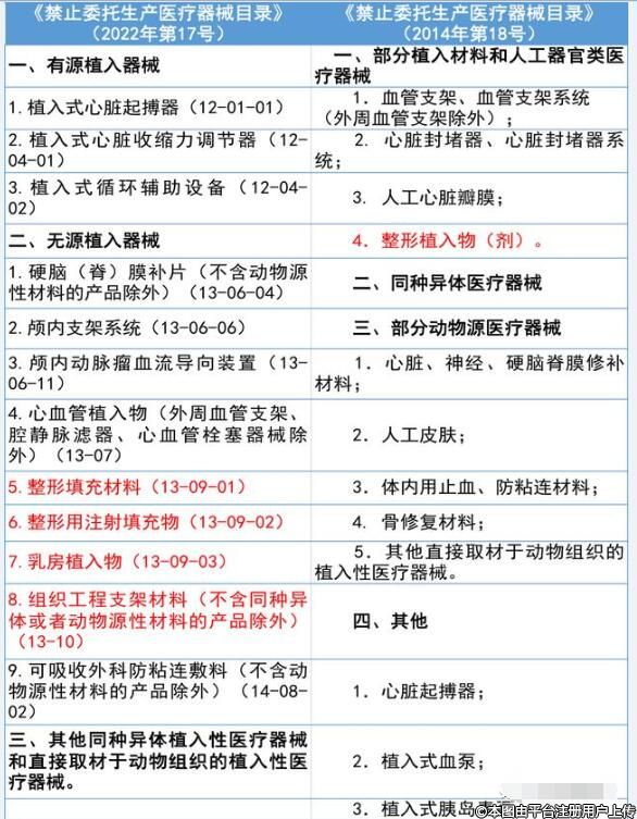 與2014年的版本相比,新修訂的《目錄》去除了生產(chǎn)工藝已較為成熟的產(chǎn)品,如腔靜脈濾器、心血管栓塞器械、植入式胰島素泵;新增及細化了近年來出現(xiàn)較多可疑不良事件的醫(yī)美植入材料:整形填充材料、整形用注射填充物、乳房植入物、組織工程支架材料。