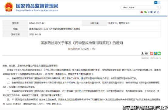 4月15日,國家藥監(jiān)局印發(fā)《藥物警戒檢查指導(dǎo)原則》,以落實《中華人民共和國藥品管理法》《中華人民共和國疫苗管理法》有關(guān)建立藥物警戒制度的要求,指導(dǎo)藥品監(jiān)督管理部門科學(xué)規(guī)范開展藥物警戒檢查工作。詳情如下: