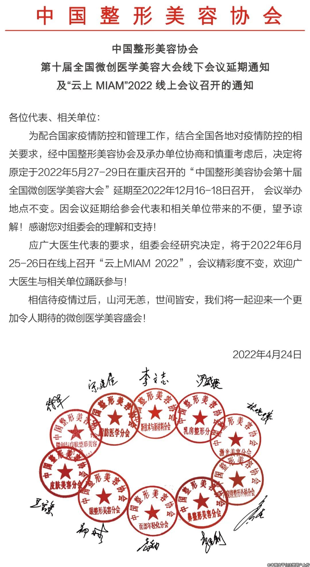 第十屆全國(guó)微創(chuàng)醫(yī)學(xué)美容大會(huì)會(huì)議延期通知及“云上 MIAM”2022 線(xiàn)上會(huì)議召開(kāi)的通知