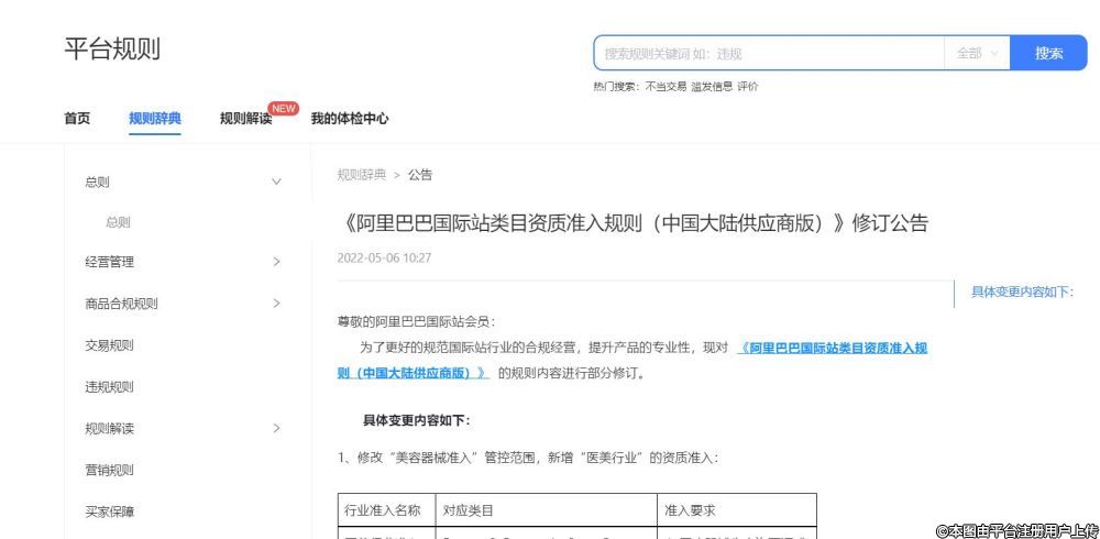 5月6日消息,今日,阿里巴巴國際站公布公告,對《阿里巴巴國際站類目資質(zhì)準(zhǔn)入規(guī)則(中國大陸供應(yīng)商版)》的規(guī)則內(nèi)容進(jìn)行部分修訂,將于2022年5月12日起正式生效執(zhí)行。