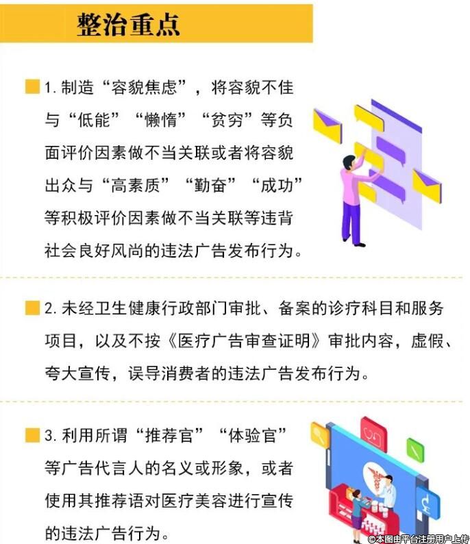 此次專項整治還將嚴肅查處違法廣告和互聯(lián)網信息。未經依法審查取得批準,嚴禁發(fā)布醫(yī)療廣告,或以新聞形式、醫(yī)療資訊服務專題(欄)、健康科普等形式變相發(fā)布醫(yī)療廣告、虛假信息。同時,加強互聯(lián)網醫(yī)美展會相關信息監(jiān)控,清理互聯(lián)網不良信息。