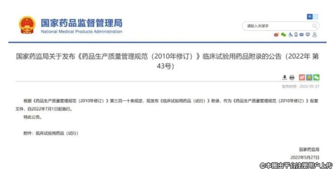 國家藥品監(jiān)督管理局根據(jù)《藥品生產(chǎn)質(zhì)量管理規(guī)范(2010年修訂)》第三百一十條規(guī)定,發(fā)布了《臨床試驗用藥品(試行)》附錄,作為《藥品生產(chǎn)質(zhì)量管理規(guī)范(2010年修訂)》配套文件,自2022年7月1日起施行。