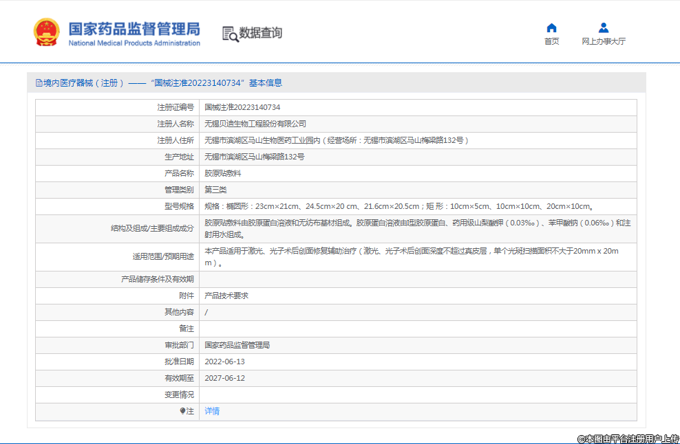 2022年6月13日,無錫貝迪生物工程股份有限公司(以下簡稱“貝迪生物”)申報(bào)的“膠原貼敷料”正式獲得國家藥監(jiān)局批準(zhǔn),注冊證號:國械注準(zhǔn)20223140734。