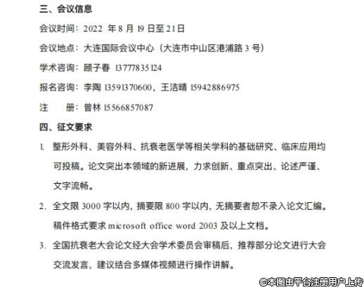 由中國整形美容協(xié)會抗衰老分會、中國整形美容協(xié)會培訓(xùn)部、大連市醫(yī)學(xué)會主辦,大連大學(xué)附屬新華醫(yī)院、大連醫(yī)科大學(xué)附屬第一院承辦的第七屆中國抗衰老醫(yī)學(xué)大會將于2022年8月19日至21日在遼寧省大連市舉行。