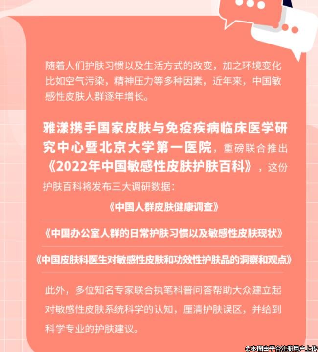 雅漾攜手國(guó)家皮膚與免疫疾病臨床醫(yī)學(xué)研究中心暨北京大學(xué)第一醫(yī)院,聯(lián)合推出《2022年中國(guó)敏感性皮膚護(hù)膚百科》,這份護(hù)膚百科將發(fā)布三大調(diào)研數(shù)據(jù):《中國(guó)人群皮膚健康調(diào)查》《中國(guó)辦公室人群的日常護(hù)膚習(xí)慣以及敏感性皮膚現(xiàn)狀》《中國(guó)皮膚科醫(yī)生對(duì)敏感性皮膚和功效性護(hù)膚品的洞察和觀點(diǎn)》。