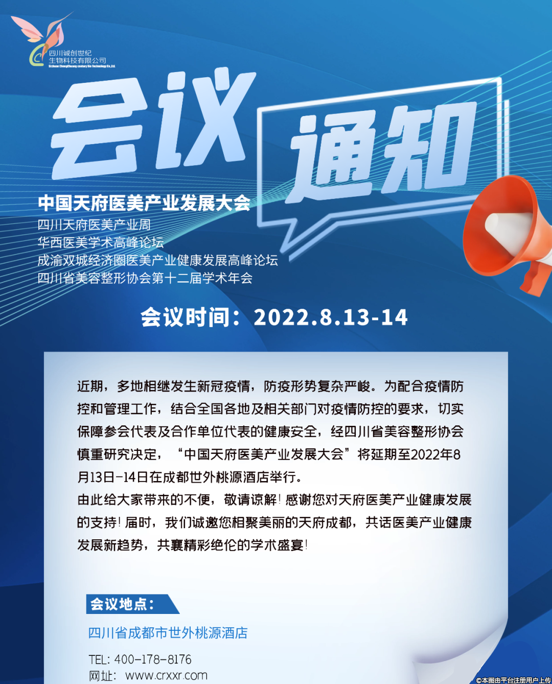由于現(xiàn)目前全國各地疫情反復,防疫形勢復雜嚴峻,結合全國各地相關部門對疫情防控的要求,配合疫情防控工作,【中國天府醫(yī)美產(chǎn)業(yè)發(fā)展大會】將延期至2022年8月13日-14日在成都世外桃源酒店舉行,會場整體安排不變。