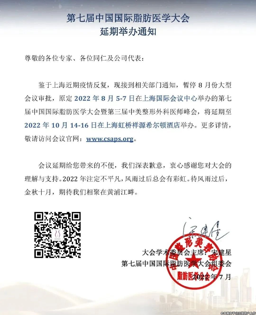 鑒于上海近期疫情反復,原定2022年8月5-7日在上海國際會議中心舉辦的第七屆中國國際脂肪醫(yī)學大會暨第三屆中美整形外科醫(yī)師峰會,將延期至2022年10月14-16日在上海虹橋祥源希爾頓酒店舉辦。