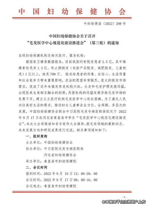 為了滿足人民向往美好生活的需求,推動(dòng)?jì)D女兒童事業(yè)全方位、全周期、多層次的發(fā)展,中國(guó)婦幼保健協(xié)會(huì)聯(lián)合中日醫(yī)院毛發(fā)專病醫(yī)聯(lián)體擬定于2022年9月17日在河北省秦皇島市共同舉辦“毛發(fā)醫(yī)學(xué)中心規(guī)范化建設(shè)推進(jìn)會(huì)”。