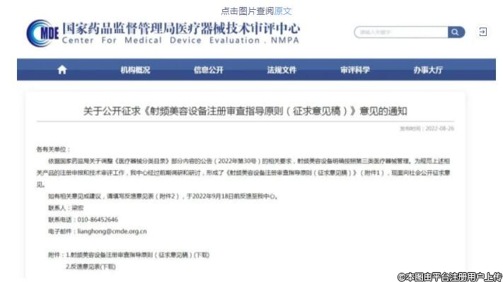依據(jù)國家藥監(jiān)局關(guān)于調(diào)整《醫(yī)療器械分類目錄》部分內(nèi)容的公告(2022年第30號(hào))的相關(guān)要求,射頻美容設(shè)備明確按照第三類醫(yī)療器械管理。為規(guī)范上述相關(guān)產(chǎn)品的注冊(cè)申報(bào)和技術(shù)審評(píng)工作,我中心經(jīng)過前期調(diào)研和研討,形成了《射頻美容設(shè)備注冊(cè)審查指導(dǎo)原則(征求意見稿)》(附件1),現(xiàn)面向社會(huì)公開征求意見。