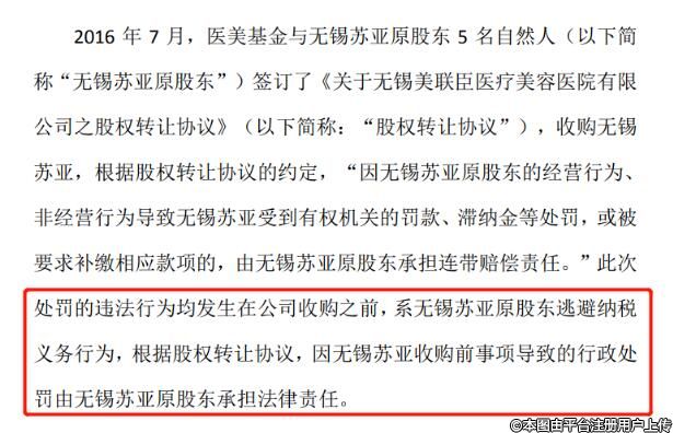 2016年7月,醫(yī)美基金與無(wú)錫蘇亞原股東5名自然人(以下簡(jiǎn)稱“無(wú)錫蘇亞原股東”)簽訂了《關(guān)于無(wú)錫美聯(lián)臣醫(yī)療美容醫(yī)院有限公司之股權(quán)轉(zhuǎn)讓協(xié)議》,收購(gòu)無(wú)錫蘇亞,根據(jù)股權(quán)轉(zhuǎn)讓協(xié)議的約定,“因無(wú)錫蘇亞原股東的經(jīng)營(yíng)行為、非經(jīng)營(yíng)行為導(dǎo)致無(wú)錫蘇亞受到有權(quán)機(jī)關(guān)的罰款、滯納金等處罰,或被要求補(bǔ)繳相應(yīng)款項(xiàng)的,由無(wú)錫蘇亞原股東承擔(dān)連帶賠償責(zé)任。”