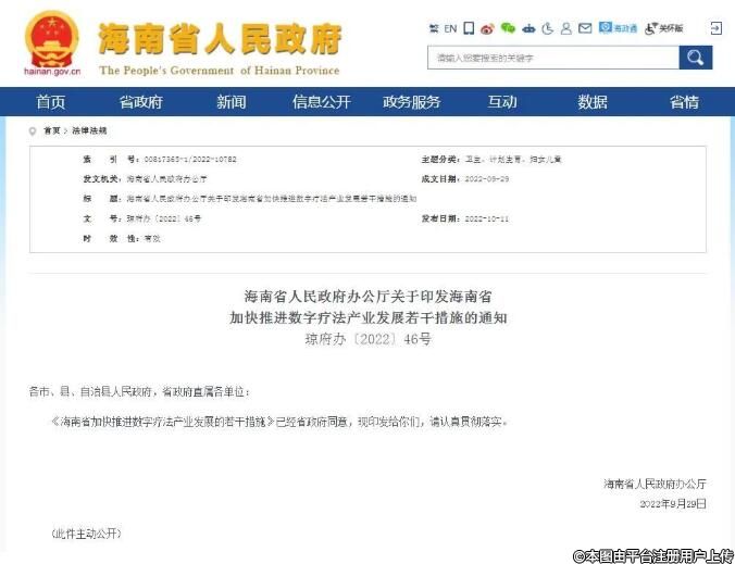10月11日消息,海南省人民政府辦公廳對(duì)外印發(fā)《海南省加快推進(jìn)數(shù)字療法產(chǎn)業(yè)發(fā)展若干措施》(以下簡(jiǎn)稱“《若干措施》”)。