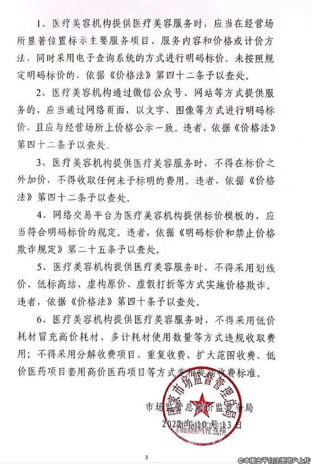10月13日,國(guó)家市場(chǎng)監(jiān)管總局價(jià)格監(jiān)督檢查和反不正當(dāng)競(jìng)爭(zhēng)局發(fā)布《醫(yī)療美容行業(yè)虛假宣傳和價(jià)格違法行為治理工作指引》,強(qiáng)調(diào)要防范8項(xiàng)虛假宣傳行為、6項(xiàng)價(jià)格違法行為,涉及在會(huì)議講座、展銷會(huì)、自媒體等場(chǎng)合進(jìn)行虛假宣傳,通過低標(biāo)高結(jié)、虛構(gòu)原價(jià)、虛假打折等方式進(jìn)行價(jià)格欺詐,這些行為均將受到嚴(yán)厲查處。具體內(nèi)容如下: