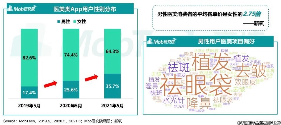 雖然目前醫(yī)美市場仍然被女性用戶主導(dǎo),但近年來醫(yī)美類App男性用戶占比明顯上升,且男性醫(yī)美平均客單價高于女性,醫(yī)美市場成為“男顏經(jīng)濟”新的掘金點。據(jù)新Y數(shù)據(jù)顏究院顯示,2021年國內(nèi)約有230萬男性進行了醫(yī)美消費。