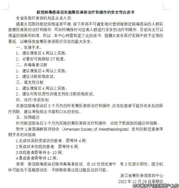近日,浙江省就發(fā)布了新冠病毒感染后實施整形美容治療和操作的安全性白皮書。
