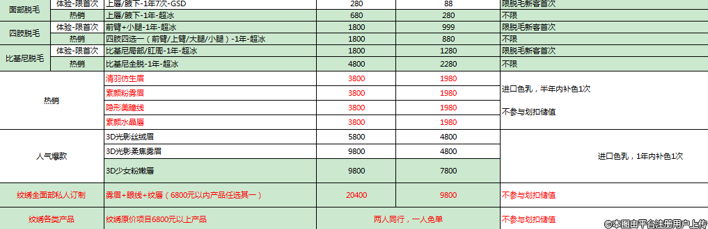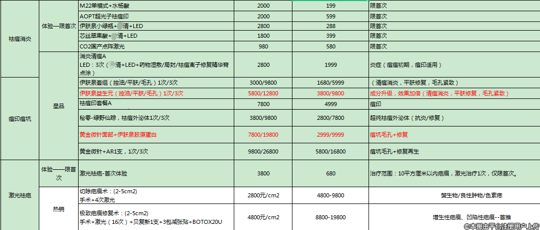 1、激光嫩膚:(1)飛頓光子嫩膚(DPL) 138;(2)M22光子嫩膚-全模式 380;(3)M22全模式+絲麗516 980;(4)AOPT超光子面部全模式 780;(5)AOPT全模式 +菲歐曼 980;(6)黑金超光子全模式 880;(7)黑金超光子全模式 + 絲麗516 1380