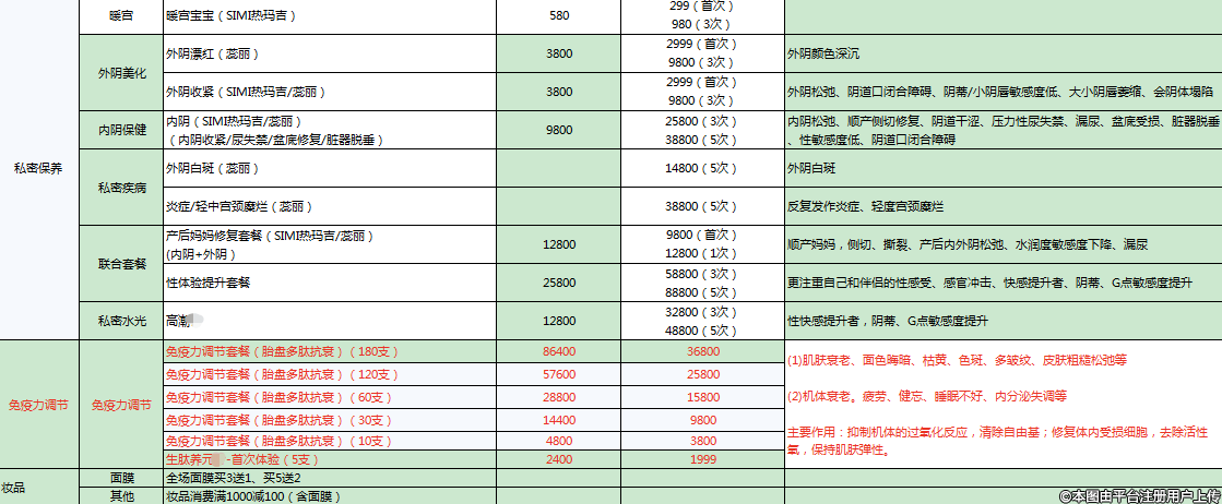 3、再生:(1)秘零-煥彩鎏金1次/3次 3800/9800;(2)喬洛施AS1支+舒敏之星1次+藥物濕敷1次+AS凍干粉1盒 2999;(3)喬洛施AR3支 5800;(4)氐殊(I+H) 4999;(5)大飛梭+喬洛施AR2支,1次/3次 9800/26800;(6)薇旖美膠原蛋白1支/3支/6支/9支 8800/25800/49800/79300