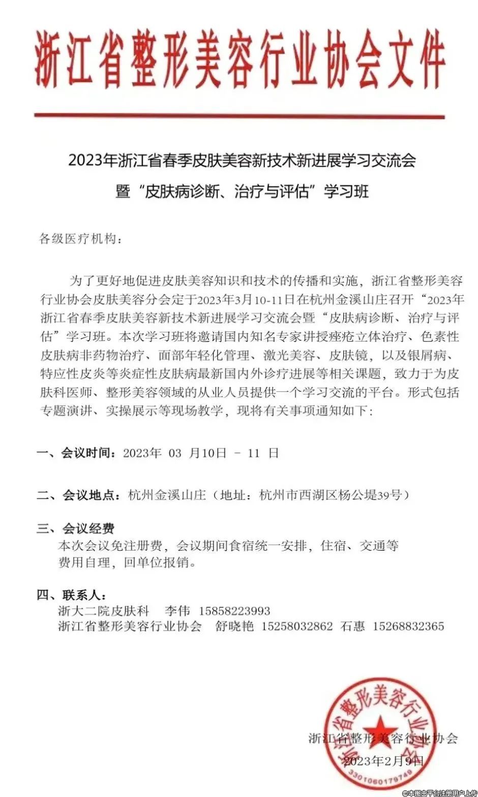 為了更好地促進皮膚美容知識和技術(shù)的傳播和實施,浙江省整形美容行業(yè)協(xié)會皮膚美容分會定于2023年3月10日-11日在杭州金溪山莊召開2023年浙江省春季皮膚美容新技術(shù)新進展學習交流會暨“皮膚病診斷、治療與評估”學習班。本次學習班將邀請國內(nèi)知名專家講授座瘡立體治療、色素性皮膚病非藥物治療、面部年輕化管理、激光美容、皮膚鏡,以及銀屑病、特應(yīng)性皮炎等炎癥性皮膚病最新國內(nèi)外診療進展等相關(guān)課題,致力于為皮膚科醫(yī)師、整形美容領(lǐng)域的從業(yè)人員提供一個學習交流的平臺。形式包括專題演講、實操展示等現(xiàn)場教學,現(xiàn)將有關(guān)事項通知如下: