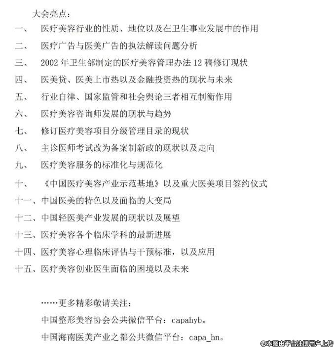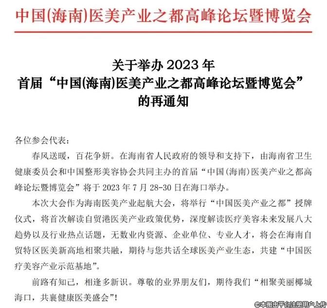 為進(jìn)一步貫徹推進(jìn)建設(shè)健康中國的國家戰(zhàn)略部署,由中國整形美容協(xié)會和海南省衛(wèi)生健康委員會共同主辦的首屆“中國(海南)醫(yī)美產(chǎn)業(yè)之都高峰論壇暨博覽會”將于2023年7月28-30日在??趪H會議展覽中心舉辦。本次大會醫(yī)美產(chǎn)業(yè)最新發(fā)展趨勢和行業(yè)熱點話題、醫(yī)療美容行業(yè)的標(biāo)準(zhǔn)化與規(guī)范化、中國醫(yī)美的特色與面臨的大變局以及醫(yī)美產(chǎn)業(yè)政策與行業(yè)監(jiān)管等主題展開分論壇交流。