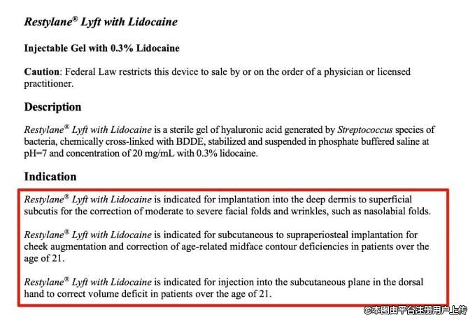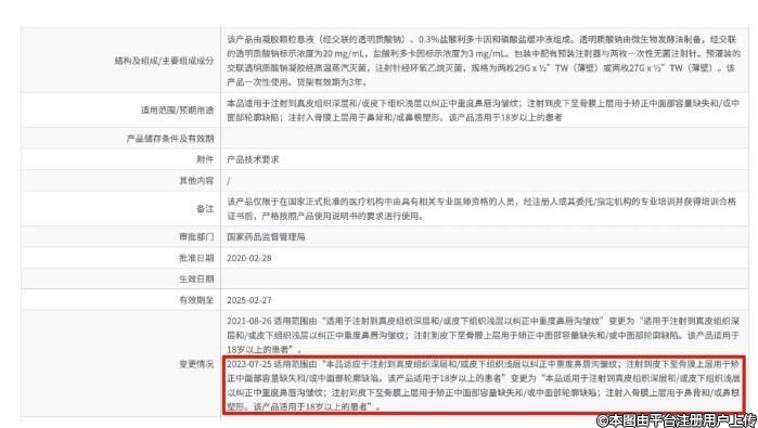由“本品適應(yīng)于注射到真皮組織深層和/或皮下組織淺層以糾正中重度鼻唇溝皺紋;注射到皮下至骨膜上層用于矯正中面部容量缺失和/或中面部輪廓缺陷。該產(chǎn)品適用于18歲以上的患者”