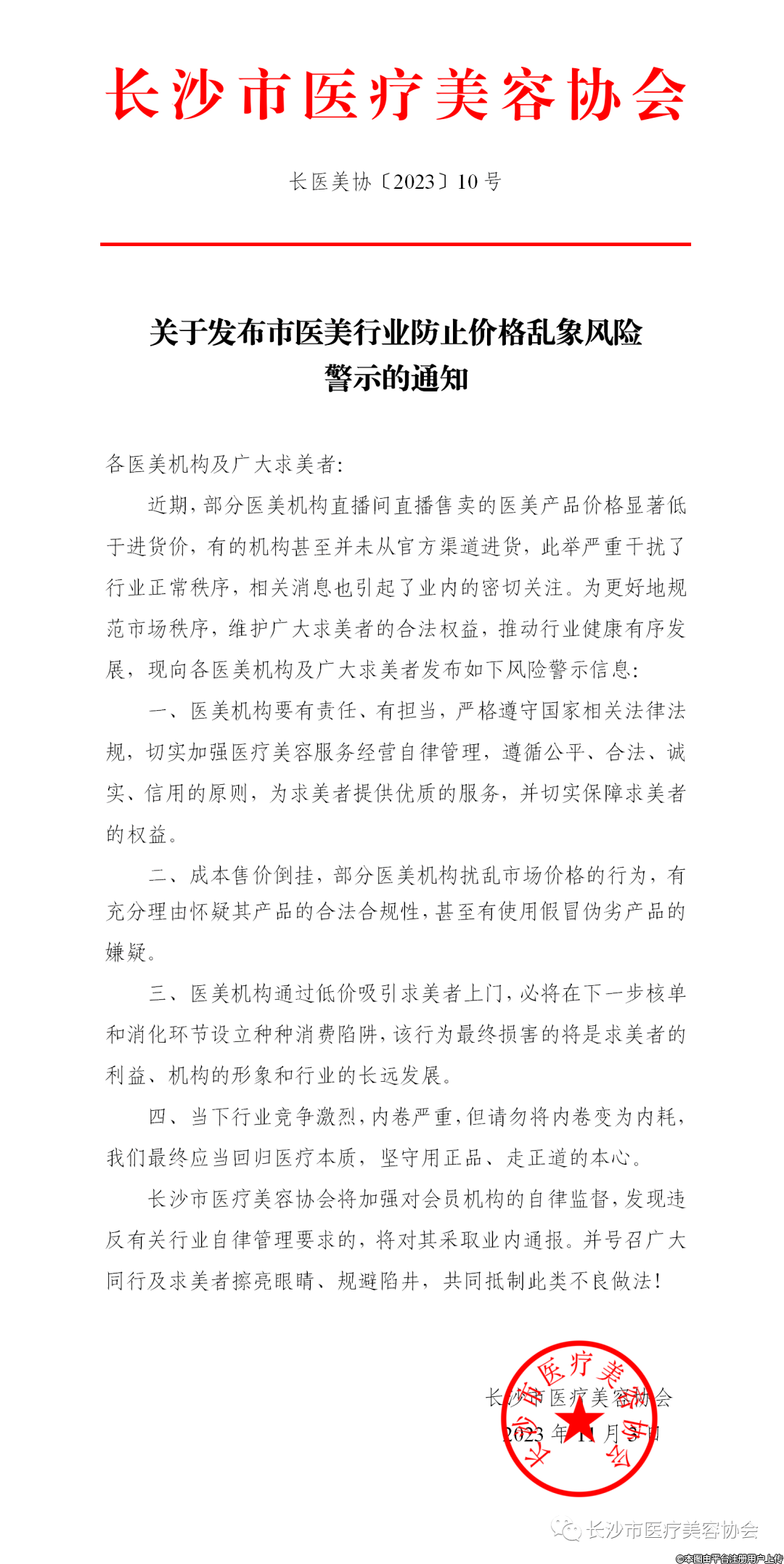 長沙市醫(yī)療美容協(xié)會微信公眾號11月3日發(fā)布《關(guān)于發(fā)布市醫(yī)美行業(yè)防止價格亂象風(fēng)險警示的通知》: