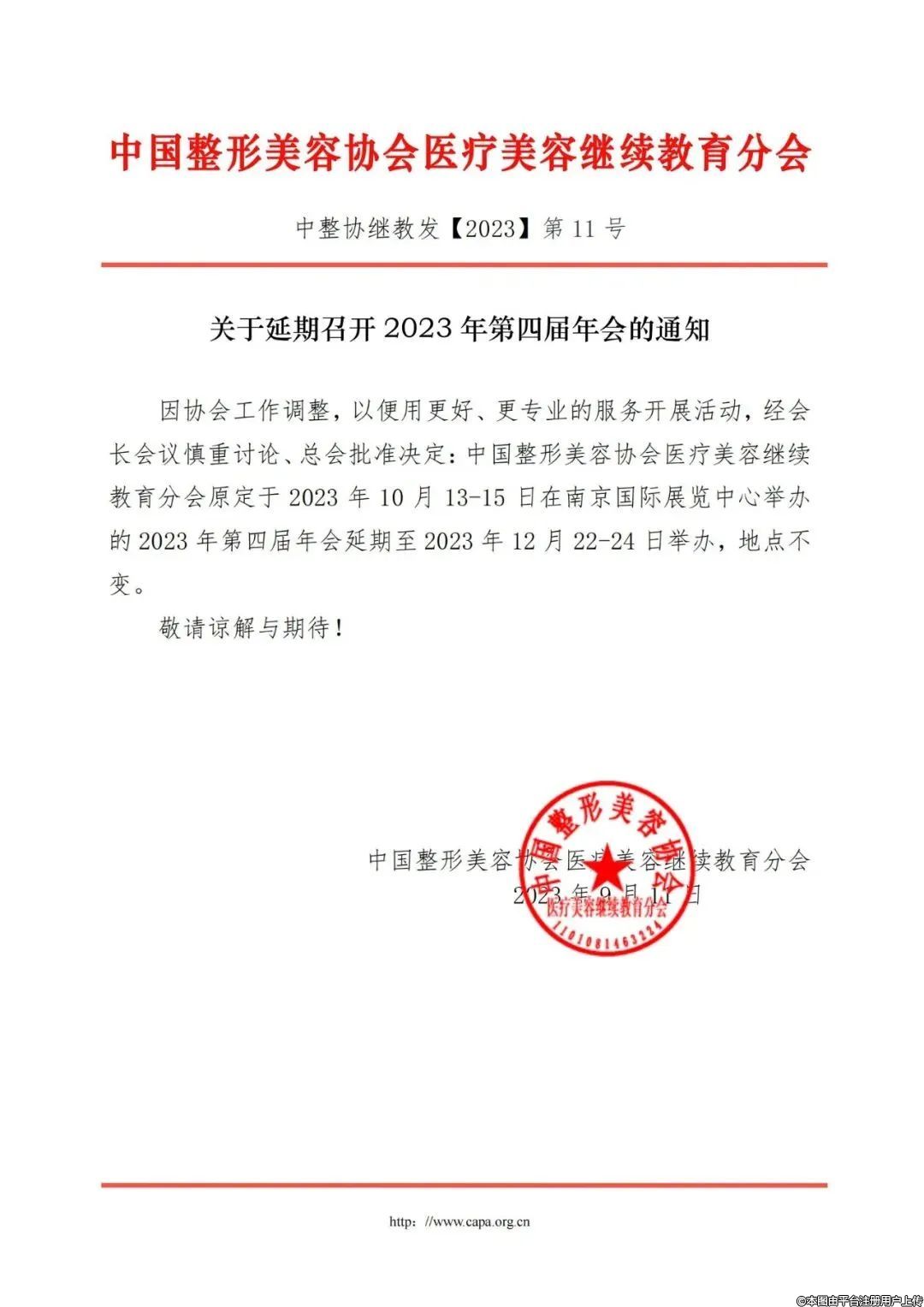 因協(xié)會工作調(diào)整,以便用更好、更專業(yè)的服務(wù)開展活動(dòng),經(jīng)會長會議慎重討論、總會批準(zhǔn)決定:中國整形美容協(xié)會醫(yī)療美容繼續(xù)教育分會原定于2023年10月13日-15日在南京國際展覽中心舉辦的2023年第四屆年會延期至2023年12月22日-24日舉辦,地點(diǎn)不變。