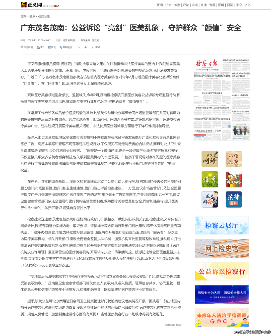 11月30日,正義網(wǎng)以《廣東茂名茂南:公益訴訟“亮劍”醫(yī)美亂象 ,守護(hù)群眾“顏值”安全》為題,報(bào)道了茂南區(qū)人民檢察院“開展醫(yī)療美容公益訴訟專項(xiàng)監(jiān)督行動(dòng)”工作做法。原文如下:
