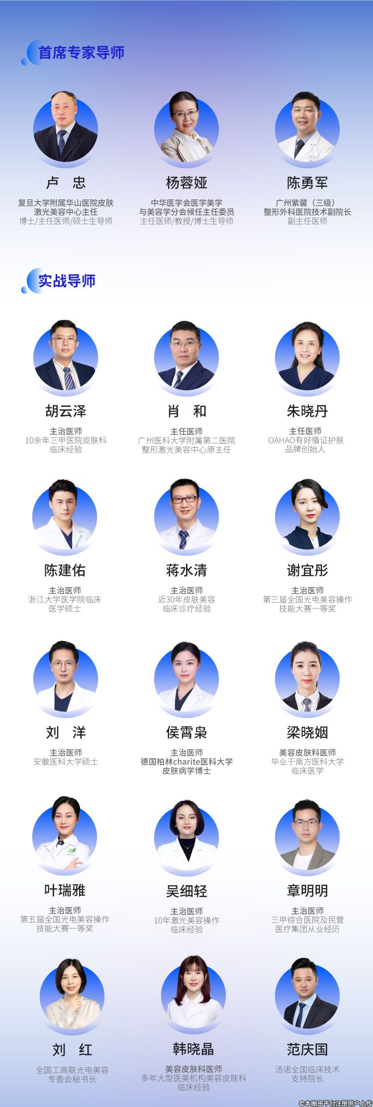 專家蒞臨,領(lǐng)銜教學(xué)!3月18日北京校區(qū),肖和、朱曉丹兩位主任醫(yī)師加入教學(xué);3月25日上海校區(qū),華山醫(yī)院皮膚科激光美容中心盧忠教授將蒞臨教學(xué),直剖斑、疤、痘、敏、抗衰老常見損容性皮膚病治療底層邏輯。同時本月會議更是加入“二氧化碳點陣激光”理論與實戰(zhàn)的教學(xué),強化激光領(lǐng)域多設(shè)備臨床動手能力。