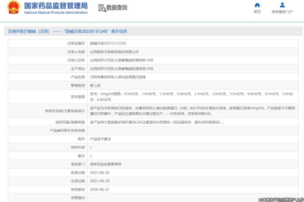 這是一款與山西錦波生物合作的械III類注射膠原蛋白,注射證號(hào)為:國(guó)械注準(zhǔn)20233131245。
