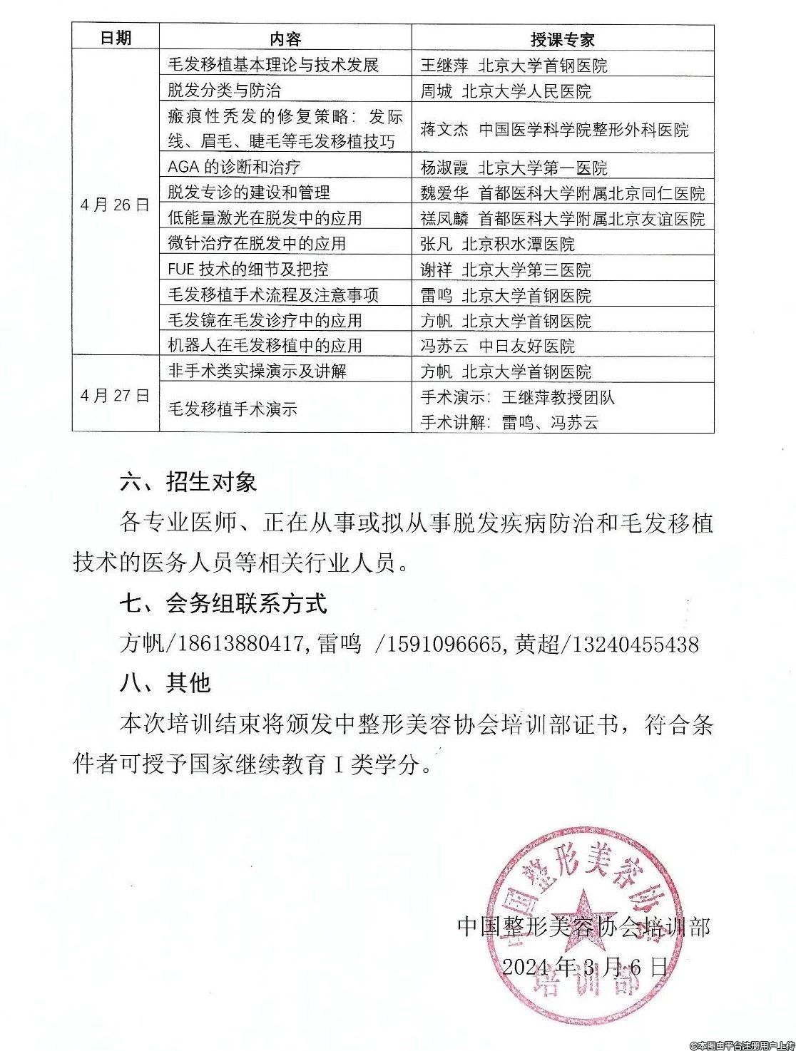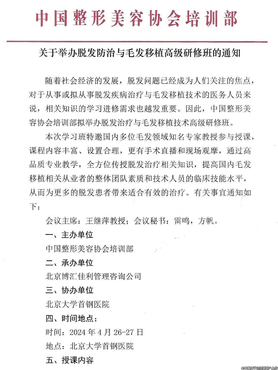 隨著社會(huì)經(jīng)濟(jì)的發(fā)展,脫發(fā)問題已經(jīng)成為人們關(guān)注的焦點(diǎn),對(duì)于從事或擬從事脫發(fā)疾病治療與毛發(fā)移植技術(shù)的醫(yī)務(wù)人員來說,相關(guān)知識(shí)的學(xué)習(xí)進(jìn)修需求也越發(fā)重要。因此,中國(guó)整形美容協(xié)會(huì)培訓(xùn)部擬舉辦脫發(fā)治療與毛發(fā)移植技術(shù)高級(jí)研修班。