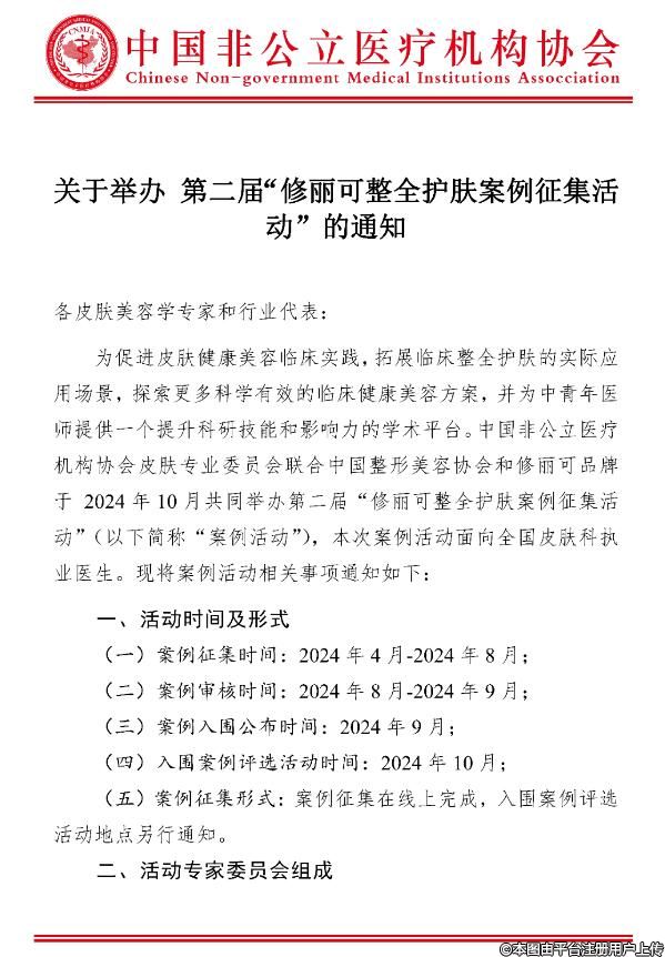 為促進(jìn)皮膚健康美容臨床實(shí)踐,拓展臨床整全護(hù)膚的實(shí)際應(yīng)用場(chǎng)景,探索更多科學(xué)有效的臨床健康美容方案,并為中青年醫(yī)師提供一個(gè)提升科研技能和影響力的學(xué)術(shù)平臺(tái)。中國(guó)非公立醫(yī)療機(jī)構(gòu)協(xié)會(huì)皮膚專業(yè)委員會(huì)聯(lián)合中國(guó)整形美容協(xié)會(huì)和修麗可品牌于 2024年10月共同舉辦第二屆“修麗可整全護(hù)膚案例征集活動(dòng)”(以下簡(jiǎn)稱“案例活動(dòng)”),本次案例活動(dòng)面向全國(guó)皮膚科執(zhí)業(yè)醫(yī)生?,F(xiàn)將案例活動(dòng)相關(guān)事項(xiàng)通知如下: