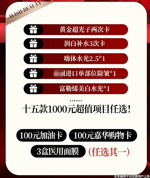 四維超頻溶脂雙下巴3次卡、面部普拉提蘋果肌提升5次卡、以色列微波暖宮3次卡、超皮秒1次卡等六大爆款項目任選其一。