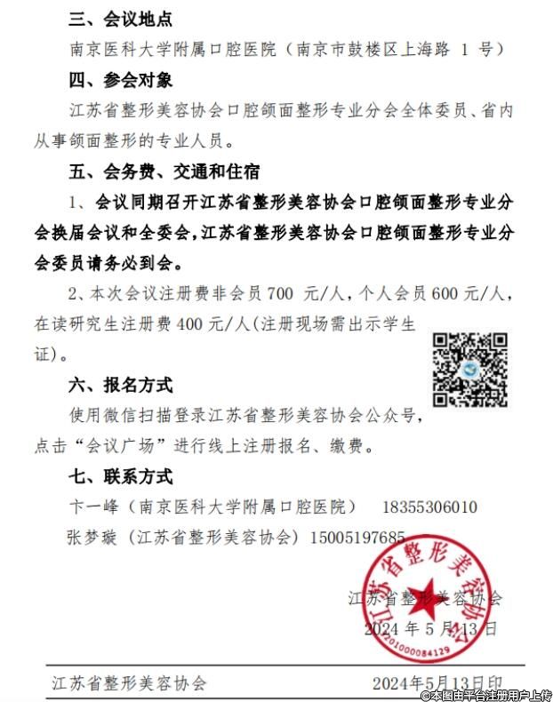 1、會(huì)議同期召開(kāi)江蘇省整形美容協(xié)會(huì)口腔頜面整形專業(yè)分會(huì)換屆會(huì)議和全委會(huì),江蘇省整形美容協(xié)會(huì)口腔頜面整形專業(yè)分會(huì)委員請(qǐng)務(wù)必到會(huì)。