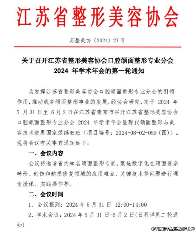 關(guān)于召開(kāi)江蘇省整形美容協(xié)會(huì)口腔頜面整形專業(yè)分會(huì)2024年學(xué)術(shù)年會(huì)的第一輪通知