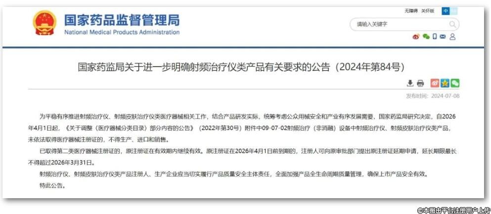 7月8日,國(guó)家藥品監(jiān)督管理局發(fā)布《關(guān)于進(jìn)一步明確射頻治療儀類產(chǎn)品有關(guān)要求的公告(2024年第84號(hào))》,宣布射頻美容儀施行第三類醫(yī)療器械管理的規(guī)定延期2年,至2026年4月1日起正式實(shí)施。