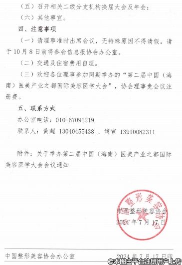 根據(jù)協(xié)會章程及年度工作安排,經(jīng)研究決定于10月26日召開中國整形美容協(xié)會2024年理事大會(同期舉辦第二屆中國(海南)醫(yī)美產(chǎn)業(yè)之都國際美容醫(yī)學(xué)大會)。