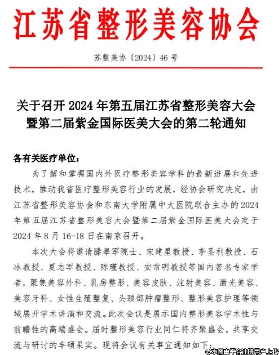 關(guān)于召開(kāi)2024年第五屆江蘇省整形美容大會(huì)暨第二屆紫金國(guó)際醫(yī)美大會(huì)的第二輪通知