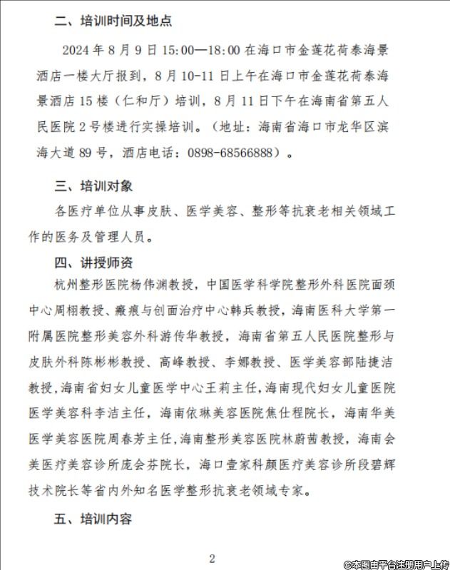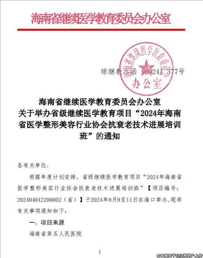 根據(jù)年度計劃安排,省級繼續(xù)醫(yī)學教育項目“2024年海南省醫(yī)學整形美容行業(yè)協(xié)會抗衰老技術(shù)進展培訓(xùn)班”【項目編號:202404042200002(省)】于2024年8月9至11日在海口舉辦。