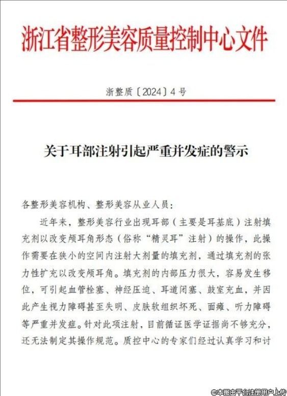 近期,我們注意到整形美容行業(yè)中出現(xiàn)了一種新的操作趨勢(shì),即通過在耳部(尤其是耳基底區(qū)域)注射填充劑來改變顱耳角的形態(tài),俗稱“精靈耳”注射。雖然這一操作旨在滿足部分消費(fèi)者對(duì)于特定耳部形態(tài)的追求,但其潛在的風(fēng)險(xiǎn)和并發(fā)癥不容忽視。請(qǐng)各位醫(yī)療美容從業(yè)人員務(wù)必高度重視以下文件浙整質(zhì)[2024]4號(hào),切實(shí)履行好自身的職責(zé)和義務(wù),保障患者的安全和健康。