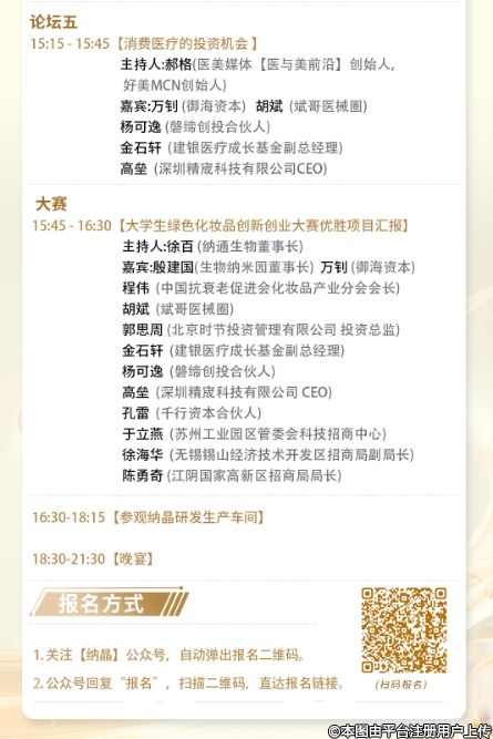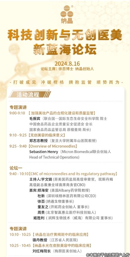 本次論壇匯聚了生物醫(yī)藥、醫(yī)療美容、美容護(hù)膚、政府監(jiān)管、大健康抗衰老、品牌營(yíng)銷、消費(fèi)醫(yī)療投資等領(lǐng)域的專家,旨在分享最新的行業(yè)洞見和技術(shù)創(chuàng)新,為您的機(jī)構(gòu)提供安全、合法、有效的解決方案。通過真實(shí)案例分析,特別是納晶的成功實(shí)踐,幫助大家了解國(guó)家強(qiáng)監(jiān)管是美容產(chǎn)業(yè)科技創(chuàng)新最大的戰(zhàn)略機(jī)遇,并探討如何擁抱監(jiān)管,實(shí)現(xiàn)合法合規(guī)的長(zhǎng)期盈利。
