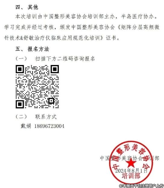 本次培訓(xùn)由中國(guó)整形美容協(xié)會(huì)培訓(xùn)部主辦,半島醫(yī)療協(xié)辦。學(xué)習(xí)完成并經(jīng)過(guò)考核,頒發(fā)中國(guó)整形美容協(xié)會(huì)《矩陣分層高頻微針技術(shù)&舒敏治療儀臨床應(yīng)用規(guī)范化培訓(xùn)》證書。