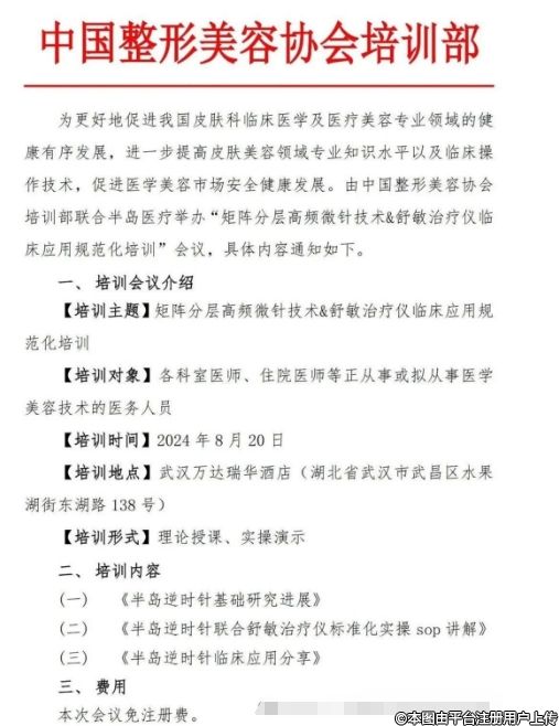 為更好地促進(jìn)我國(guó)皮膚科臨床醫(yī)學(xué)及醫(yī)療美容專業(yè)領(lǐng)域的健康有序發(fā)展,進(jìn)一步提高皮膚美容領(lǐng)域?qū)I(yè)知識(shí)水平以及臨床操作技術(shù),促進(jìn)醫(yī)學(xué)美容市場(chǎng)安全健康發(fā)展。由中國(guó)整形美容協(xié)會(huì)培訓(xùn)部聯(lián)合半島醫(yī)療舉辦“矩陣分層高頻微針技術(shù)&舒敏治療儀臨床應(yīng)用規(guī)范化培訓(xùn)”會(huì)議,具體內(nèi)容通知如下,