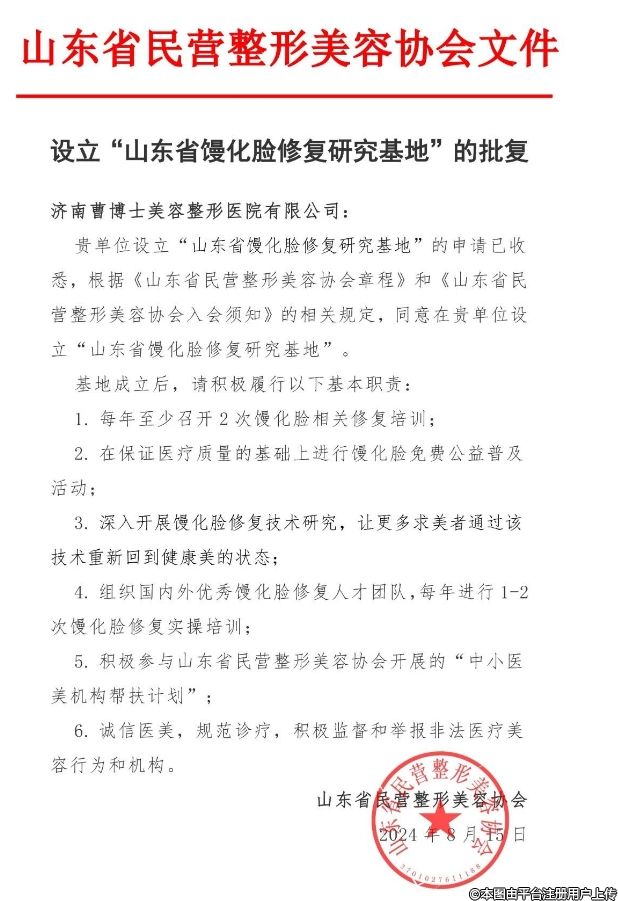 貴單位設立“山東省饅化臉修復研究基地”的申請已收悉,根據(jù)《山東省民營整形美容協(xié)會章程》和《山東省民營整形美容協(xié)會入會須知》的相關規(guī)定,同意在貴單位設立“山東省饅化臉修復研究基地”