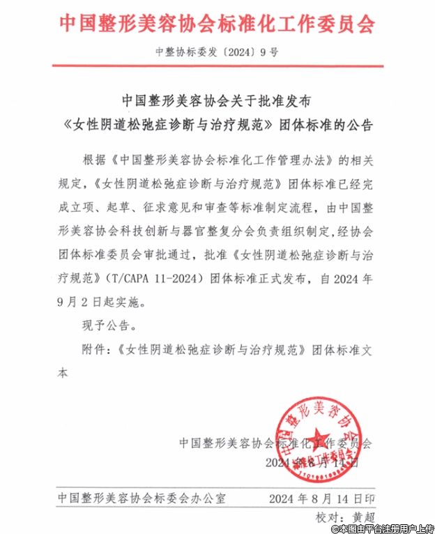 根據《中國整形美容協(xié)會標準化工作管理辦法》的相關規(guī)定,《女性陰道松弛癥診斷與治療規(guī)范》團體標準已經完成立項、起草、征求意見和審查等標準制定流程,由中國整形美容協(xié)會科技創(chuàng)新與器官整復分會負責組織制定,經協(xié)會團體標準委員會審批通過,批準《女性陰道松弛癥診斷與治療規(guī)范》(T/CAPA 11-2024)團體標準正式發(fā)布,自2024年9月2日起實施。