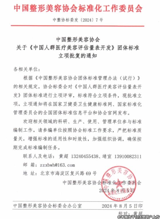 根據(jù)《中國整形美容協(xié)會團體標(biāo)準(zhǔn)管理辦法(試行)》的相關(guān)規(guī)定,協(xié)會標(biāo)委會對《中國人群醫(yī)療美容評估量表開發(fā)》團體標(biāo)準(zhǔn)進行立項評審,標(biāo)準(zhǔn)符合立項條件,現(xiàn)批準(zhǔn)立項。立項通知將在國家衛(wèi)健委衛(wèi)生健康標(biāo)準(zhǔn)網(wǎng)、國家標(biāo)準(zhǔn)化管理委員會的全國團體標(biāo)準(zhǔn)信息平臺和協(xié)會官網(wǎng)發(fā)布。