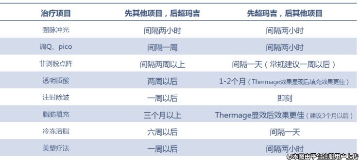 超瑪吉構(gòu)建皮膚底層基礎(chǔ)更側(cè)重于緊致提升+除皺,聯(lián)合不同的項(xiàng)目治療會(huì)產(chǎn)生1+1大于2的抗衰效果。但是項(xiàng)目做的先后順序和間隔時(shí)間,一定要掌握好,下面直接放圖吧!