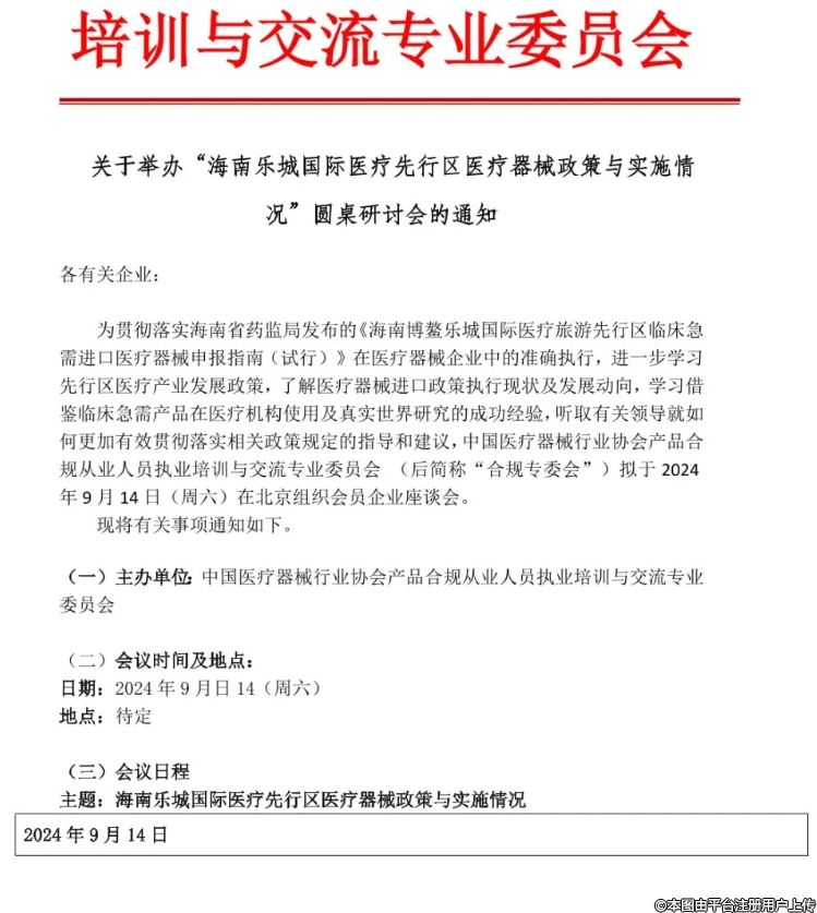 關(guān)于舉辦“海南樂城國際醫(yī)療先行區(qū)醫(yī)療器械政策與實施情況”圓桌研討會的通知