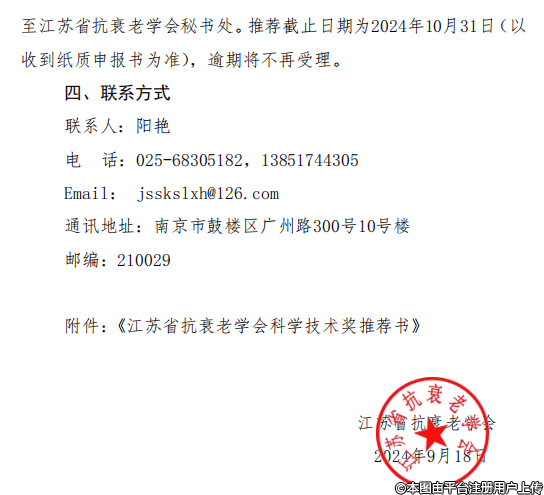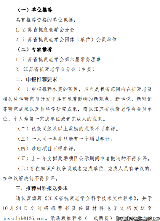 請(qǐng)認(rèn)真填寫《江蘇省抗衰老學(xué)會(huì)科學(xué)技術(shù)獎(jiǎng)推薦書》,并于10月24日之前將推薦書及佐證材料電子文檔發(fā)送至jsskslxh@126.com。