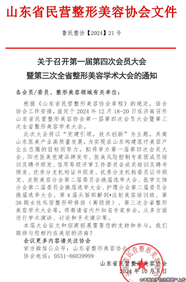 根據(jù)《山東省民營整形美容協(xié)會章程》的規(guī)定,結合協(xié)會工作安排,茲定于2024年12月18-20日在濟南召開山東省民營整形美容協(xié)會第一屆第四次會員大會暨第三次全省整形美容學術大會。